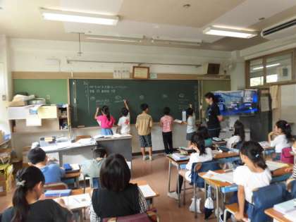 数の分解の学習をしています。各自で問題を解いたり、黒板に出てみんなに説明をしたりしています。