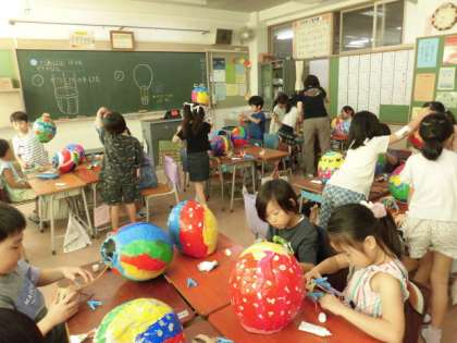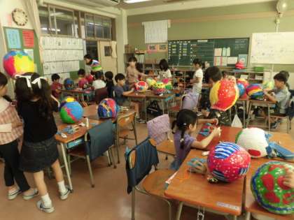 1年生の授業は図工です。気球づくりをしています。