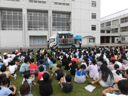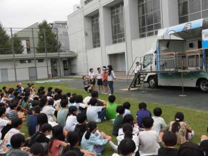 まずは、全校児童の前で4人の5年生が体験を行い、感想を発表しました。