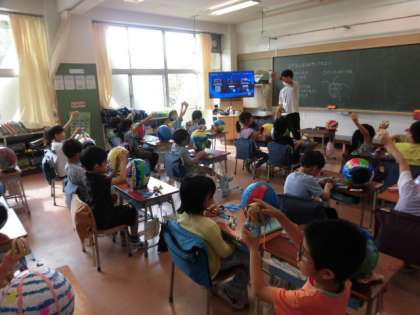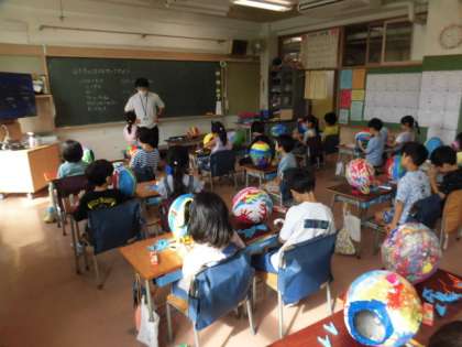 1年生の授業は図工です。気球の風船とカゴを毛糸でつけています。