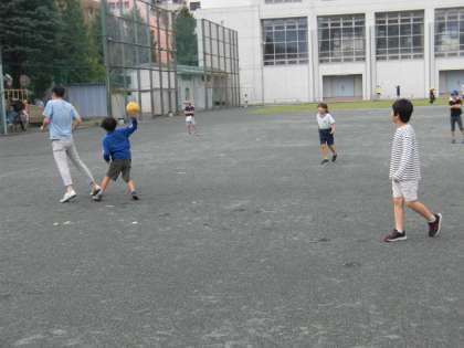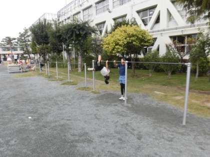 子どもたちは元気に遊んでいます。ボール遊びでは、先生が子どもたちにボールを当てられています。鉄棒では3年生が高い鉄棒で技を見せてくれました。