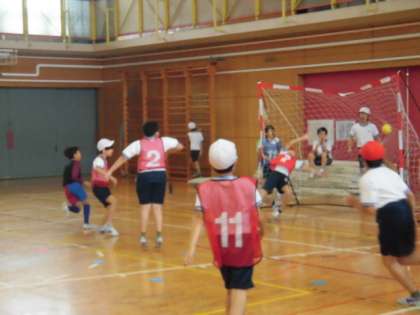 シュート練習の後は、ゲームです。バスケットボールと比べると、力加減をすることなく、思い切りボールを投げるハンドボールは、取り組みやすいのかもしれません。