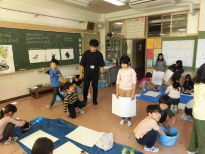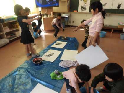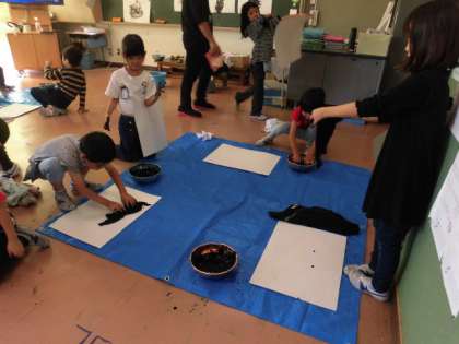 布に墨汁をつけ、下に置いてある画用紙に向けて上から落とします。その際にできた墨汁の形をカラスに見立て、作品を作っていきます。