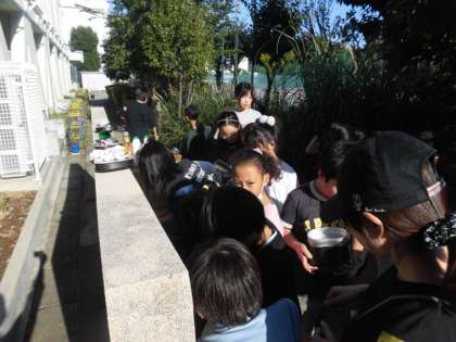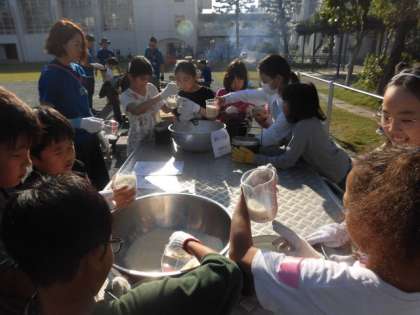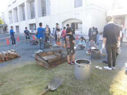子どもたちが準備をしています。かまどに火をつける人、お米の量を測り飯盒に入れる人、お米を洗う人、みんながカレーライスづくりの準備をしています。かまどには火が付き、煙があがっています。子どもたちがうちわであおいでいます。