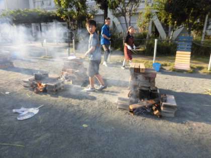 かまどに火がついています。子どもたちはまきをくべ、うちわであおいでいます。煙が顔の方に来ると、「うわっ」と言って逃げています。しかし、とても楽しそうです。