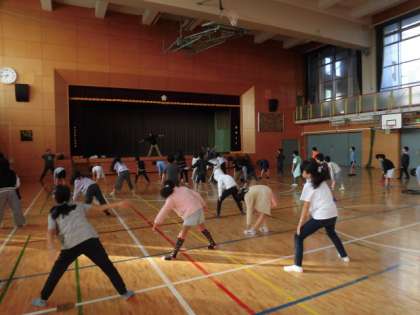 これからの動きの説明がありました。そのあとは、ラジオ体操です。ラジオ体操を知らない子どもたちですが、88会の方々が前でやってくれていたので、子どもたちはしっかりと体操することができていました。