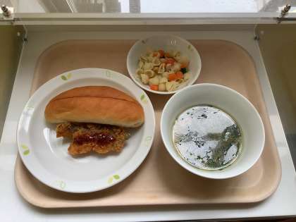 牛乳・セルフフィッシュサンド・そぼろスープ・マカロニサラダ