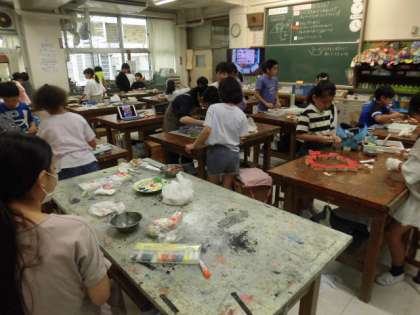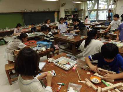 4年生の授業は図工です。木を切って釘でつなげる「わくわくアート」作りです。