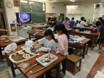 釘でつなげたものに色付けをしています。作品がだんだんと出来上がっていきます。子どもたちは楽しそうに作品作りをしています。