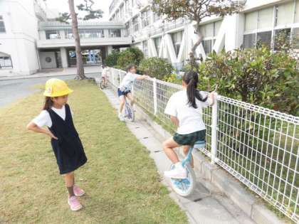 昼休みになりました。今日の昼休みは低学年の人たちと一輪車をしました。柵に手をかけて練習をしています。低学年の人たちは、この休み時間だけでも、バランスをとるのがうまくなっているのが分かります。子どもって、すごいです。わたしも1輪車に一人ですいすい乗れるように頑張ります。