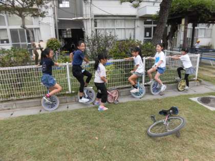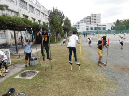 子どもたちが校庭で遊んでいます。ボール遊びをしてている人、竹馬や一輪車で遊んでいる人、6年生の中には、先日のブラックラムズのラグビー体験でもらったラグビーボールで遊んでいる人もいます。今日は、竹馬が大人気のようです。