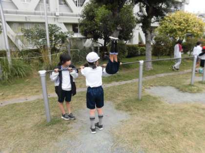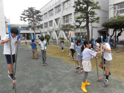 子どもたちはいろいろな遊びをしています。4年生が集まり竹馬をやっています。竹馬大流行です。わたしも競争などをして楽しく遊びました。