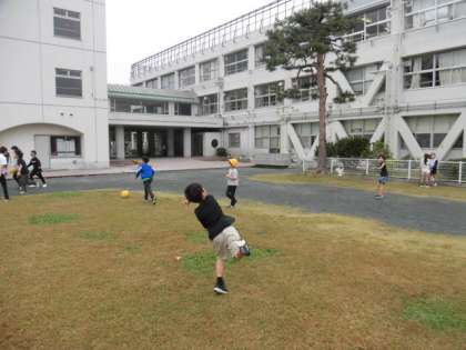 朝は雨が降っていましたが、雨はあがっています。子どもたちが校庭に出てきました。