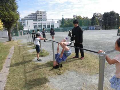 今日も4年生は竹馬、2年生は紙飛行機で遊んでいる人がたくさんいます。鉄棒で遊んでいる人もたくさんいます。