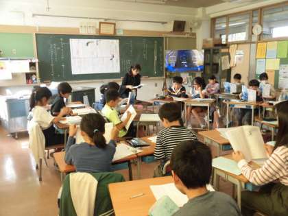 3年生の授業は国語です。物語「ちいちゃんのかげおくり」の読み合わせをしています。