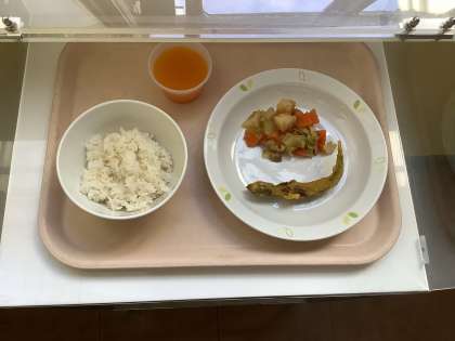 牛乳・麦ご飯・ししゃものカレー揚げ・和風じゃがいもサラダ・キャロットゼリー