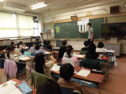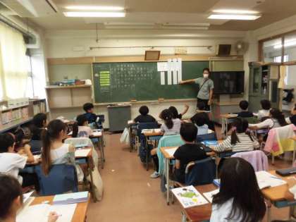 かけ算の学習です。かけ算の仕組みについてみんなで考えています。どうしてかけ算になるのかしっかりと理解してほしいです。