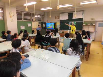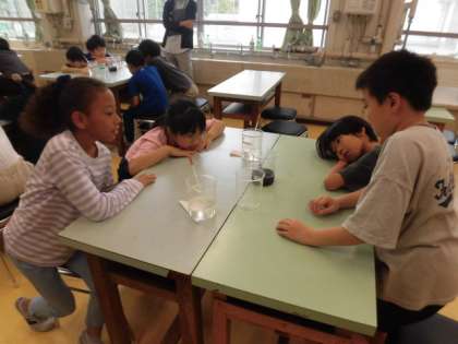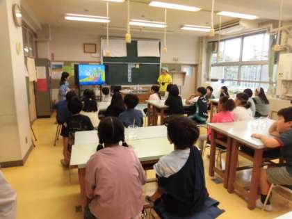 4年生の授業です。水道キャラバンの方々にゲストティーチャーにいらしていただき、水について教えていただきました。水がきれいになっていく仕組みや浄水場について教えてもらいました。汚れが沈殿していく様子などの実験も行いました。