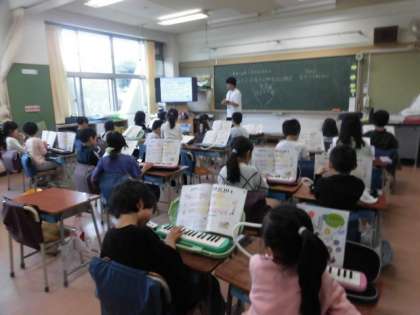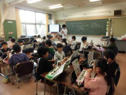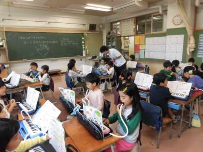 1年生の授業は音楽です。鍵盤ハーモニカの学習をしています。親指から小指までの5本の指を使って、演奏する練習をしています。