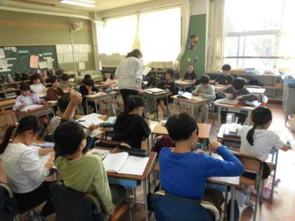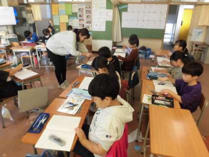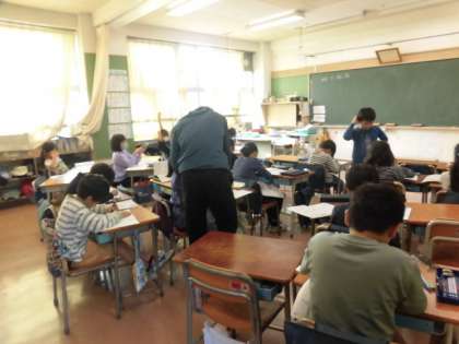 3年生の授業は算数です。コンパスを使って円を描いています。