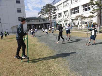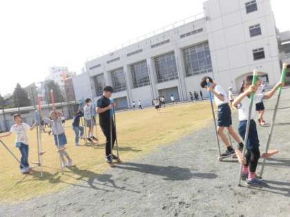 今日は6年生と竹馬をしました。担任の先生もやっています。4年生から始まった竹馬人気、6年生にも広がっています。