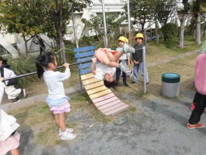 鉄棒で遊んでいる人もいます。これまた、「校長先生見て。」そう言われ見ていると、鉄棒でくるくる回っています。目が回らないか心配になります。