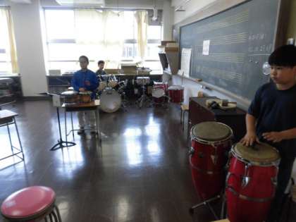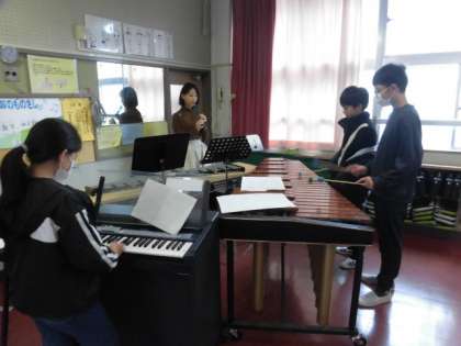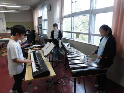 グループで集まって、一人ひとり担当する楽器の練習をしています。グループの中で声を掛け合って練習しています。全体で演奏するときには、聴きにいきたいです。