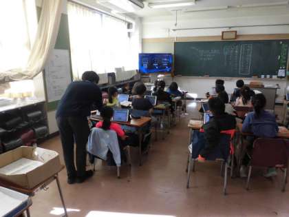 タブレットに問題を記入し、みんなで解き合いをしています。ICT支援員の先生も一緒です。子どもたちは楽しそうに問題を解いています。