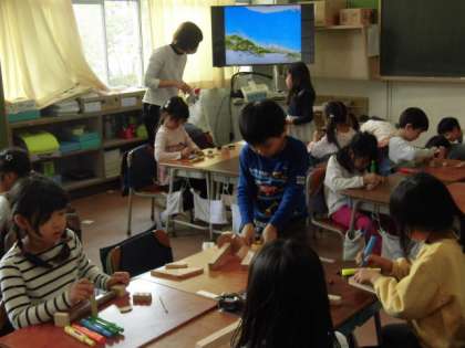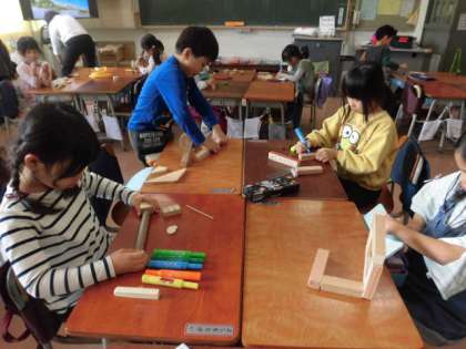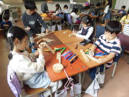 子どもたちは、木の形を生かして、ペンで模様や色を塗っています。