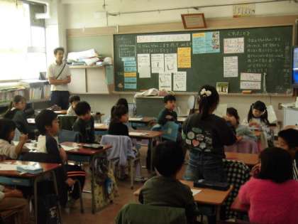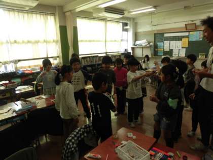 一人ひとりびゅんびゅんごまをつくっています。はじめは、全体で説明を聞き、一人ひとりでびゅんびゅんごまを作り、遊びます。そのあと、困ったことや工夫したことなどをみんなで話し合い、最後の作成に生かします。