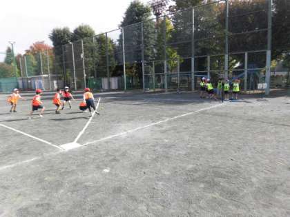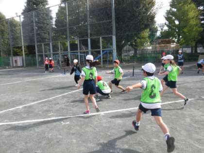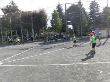 守りの人は、打ったボールをとって、みんなが座れば、次の進塁を防ぐことができます。みんなで、打ったボール目がけて走っています。そして、一斉に座ります。