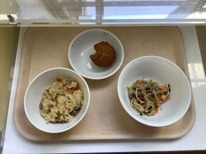 今日は沖縄献立です。珍しい名前に子供たちからは「これなにー!」という声がいっぱいありました。毎日の給食のお便りで献立の説明を行いました。