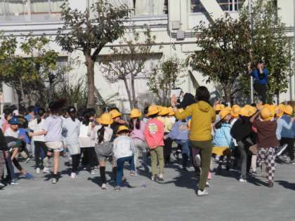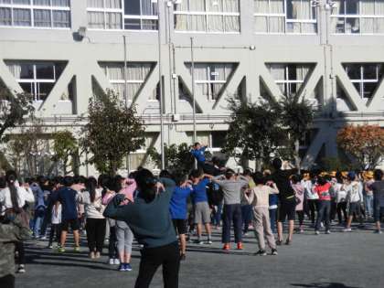 今日の朝の活動は体育集会です。身体の部位をさまざまに動かす運動です。リズムに合わせ、普段行わないような動きをします。身体を動かしているうちに気持ちのほぐれてきます。