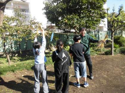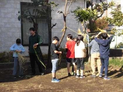 稲刈りで収穫したものは、捨てるところがないとよくいいます。楽しそうに作業をする子どもたちです。