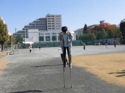 竹馬を長い期間練習していた4年生、こんなに高い竹馬に乗れるようになりました。