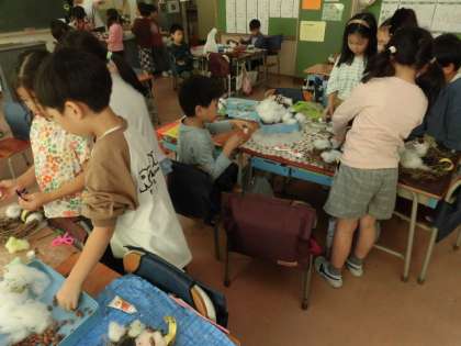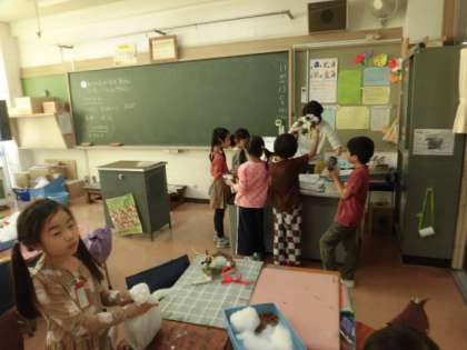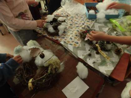 育てていたアサガオの弦を使ったリースづくりの仕上げです。ドングリや落ち葉、綿やフェルトなどを使い、飾りをつけています。可愛いリースが出来上がっていきます。