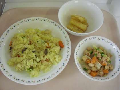 パエリア 牛乳 ビーンズサラダ スパイシーポテト