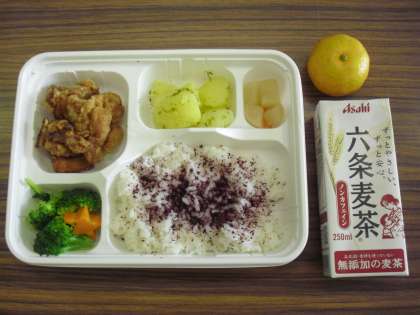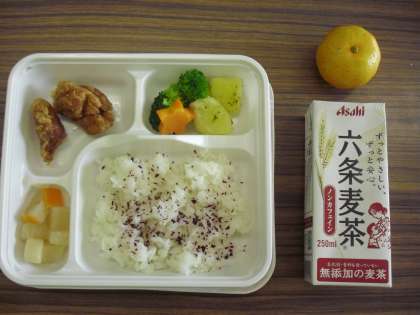お弁当給食:ゆかりごはん 麦茶 鶏肉のからあげ 温野菜 大根の含め煮 青のりポテト みかん