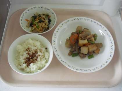 ごはん かつおでんぶ 牛乳 いりどり煮 油揚げ入りおひたし