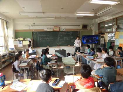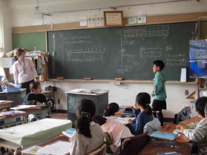 3年生の授業は算数です。少数の学習です。ポイントが10こ集まると1点になります。