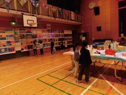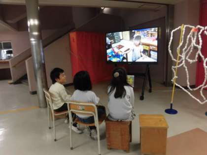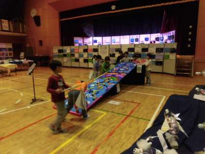 今日は展覧会の児童鑑賞日です。2年生が鑑賞しています。いろいろな学年の作品を見て、メモを取っています。3年生のビー玉転がしで遊んでいる人もいます。作成過程をおさめたビデオに見入っている人もいます。