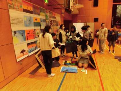 6年生は展覧会の作品を搬出しています。子どもたちは自分の作品を手にして、図工室や教室に戻ります。もう一度かくにんするように、自分の作品をながめている人もいます。