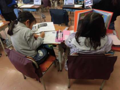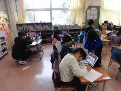 今までの学習を生かして、じどうしゃずかんを作っています。自動車を一種類選び、その自動車の絵を描き、言葉で説明をします。本を見ながら絵や文章をかく子どもたち、とても楽しそうです。