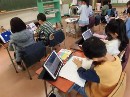 1年生の授業は国語です。説明文「じどうしゃくらべ」の学習です。