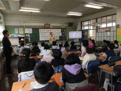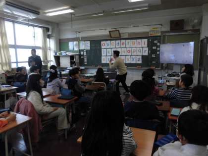 4年生の授業は外国語です。ALTの先生が来ています。