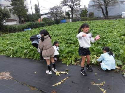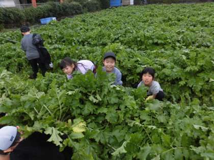 子どもたちが大根を抜きます。大根の葉がとても大きく成長しています。子どもたちがかくれてしまうほどです。なかなか抜けない人もいます。手伝ってもらわないとだめなようです。