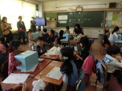 立方体、直方体、円柱、球の4つがあります。それぞれの特徴を子どもたちがまとめていきます。そして、最後には、箱の中に入った立体の特徴を言い、周りの人にあててもらうゲームをしました。