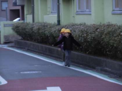道路の白線を綱渡りのようにバランスをとりながら歩いている1年生もいます。