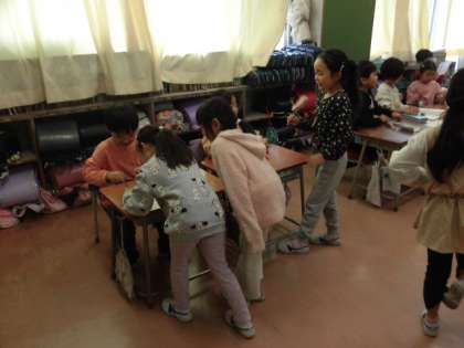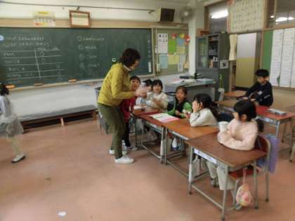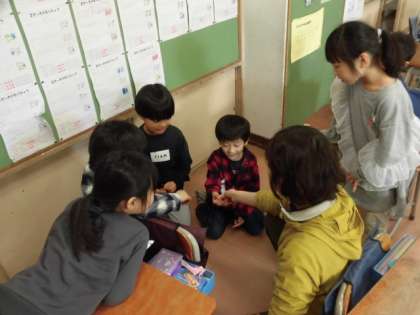 1年生の授業は生活です。手作りおもちゃでお店屋さんごっこをしています。