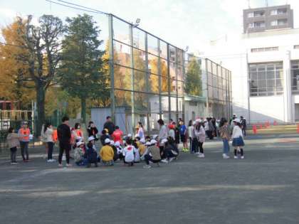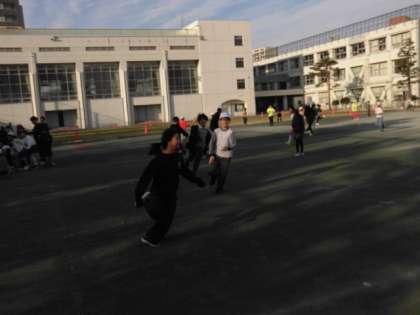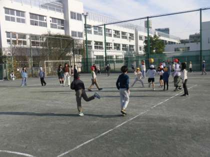 今日の朝の活動はたてわり班遊びです。6年生を中心に子どもたちが集まり、班ごとに遊びます。ドッジボール、おにごっこ、輪を使った遊びなど、さまざまです。